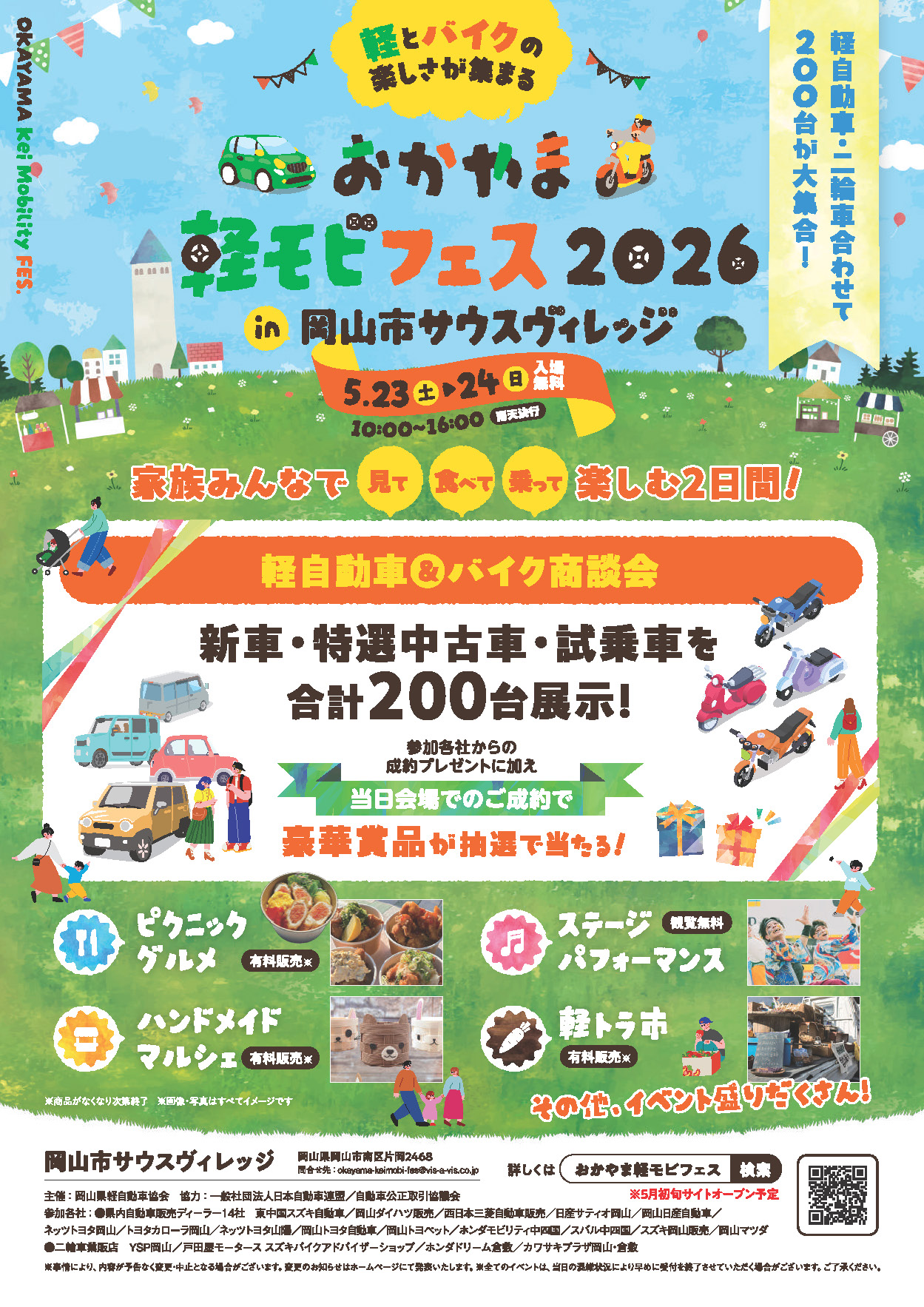 2026年5月23日~24日の2日間、岡山市サウスヴィレッジにおいて、岡山県軽自動車協会の会員ディーラー14社と2輪メーカー4社による展示・商談会を開催します。